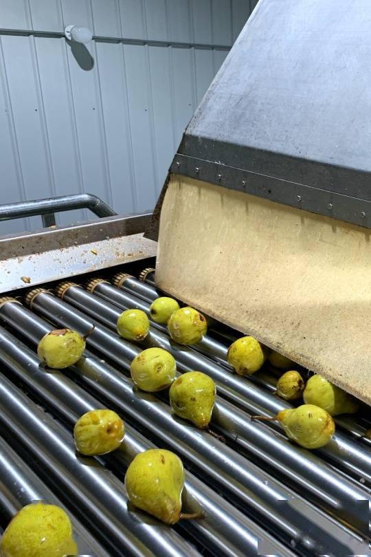 果农们正把一车车自家种植的金黄、透亮、可口的雪梨运到公司里,公司的各条生产线也开足马力生产,保证了果农稳定增收。